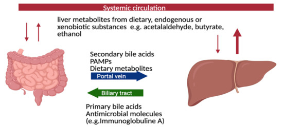- Tripathi, A.; Debelius, J.; Brenner, D.A.; Karin, M.; Loomba, R.; Schnabl, B.; Knight, R. The gut–liver axis and the intersection with the microbiome. Nat. Rev. Gastroenterol. Hepatol. 2018, 15, 397–411. [Google Scholar] [CrossRef]