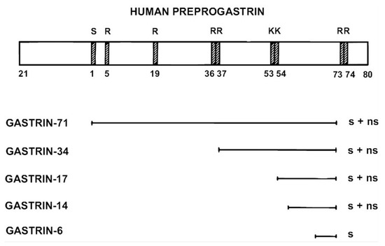 Scheme of carboxyamidated products of preprogastrin. Endoproteolytic cleavage sites (R and K) are shown on preprogastrin. S and ns mean “sulfated” and “non-sulfated”, respectively.