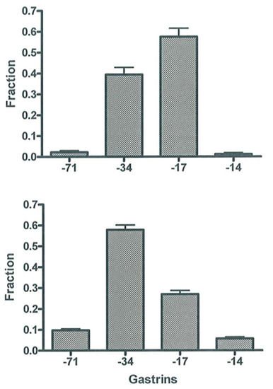 Early studies showed—as also described before [38]—that plasma or serum from normal fasting subjects and normogastrinemic patients with duodenal ulcer contain almost similar concentrations of gastrin-34 and gastrin-17 and only little of other molecular forms [45], as shown in Figure 4 (upper panel). After a protein-rich meal, the initial rise in gastrin concentrations is due mainly to gastrin-17, but later gastrin-34 prevails [45]. This shift is in accordance with the content of gastrins in the secretory granules of antral G cells. Hence, normal G cells in a human contain, as mentioned, mostly gastrin-17 and only around 10% gastrin-34 [42,46]. However, since the metabolic clearance of, for instance, gastrin-34 from the circulation is 10-fold slower than that of gastrin-17 [58], peripheral plasma contains almost equal amounts of the two gastrins in the basal state and 30–45 min after larger meals [45].