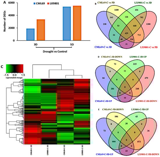Differentially expressed genes (DEGs) in CML69 and LX9801 during drought conditions. (A) Graphic presentation of DEGs in 3D and 5D stress treatment of both CML69 and LX9801. (B) Venn diagram showing DEGs’ profile in both inbred lines after drought treatment. (C) Heatmap showing the clustering analysis of 2219 common drought-responsive genes. (D) Venn diagram showing the comparison of DEGs expressed at 3D drought stress in both inbred lines. (E) Venn diagram showing the comparison of DEGs expressed at 5D drought stress in both inbred lines. Drought treatments are labeled as control (C), three days (3D), and five days (5D).