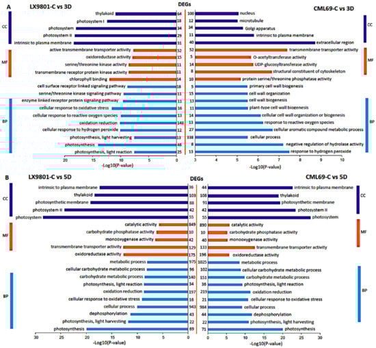 Gene Ontology enrichment analysis of the common drought-responsive genes. (A) DEGs expressed at 3D drought stress. (B) DEGs expressed at 5D drought stress. The GO terms shown here are the topmost biological process (BP), molecular functions (MF), and cellular component (CC) categories from the tolerant line (CML69) and susceptible line (LX9801). Drought treatments are labeled as control (C), three days (3D), and five days (5D).