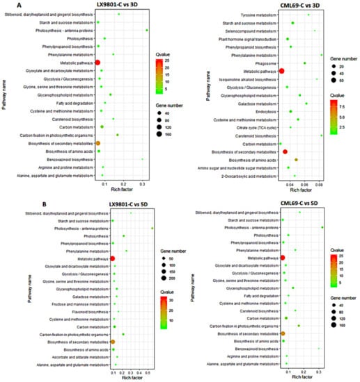 KEGG pathway enrichment analysis of the common drought-responsive genes. (A) DEGs expressed at 3D drought stress. (B) DEGs expressed at 5D drought stress. The experimental comparisons were based on the hypergeometric test, while the significance of the enrichment of the KEGG pathway is based on the q value (q < 0.05). The “rich factor” shows the DEGs’ ratio to the total gene number in specific pathways. Drought treatments are labeled as control (C), three days (3D), and five days (5D).