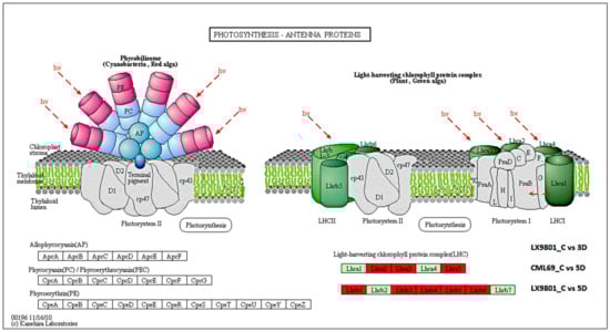 KEGG map of the photosynthetic antenna proteins. It is an analysis of DEGs, comparing drought-treated and control samples in both CML69 and LX9801. Boxes in a red frame indicate that the corresponding DEGs were downregulated in the drought-treated samples, and the boxes with a green frame suggest that the expression levels of the related genes were not changed as determined by our RNA-seq. Drought treatments are labeled as control (C), three days (3D), and five days (5D), and all genes’ abbreviations are defined in Table S9.