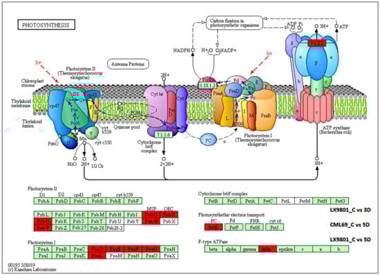 KEGG map of the photosynthesis pathway. It is an analysis of DEGs, comparing drought-treated and control samples in both CML69 and LX9801. Boxes in a red frame indicate that the corresponding DEGs were downregulated in the drought-treated samples, and the boxes with a green frame suggest that the expression levels of the related genes were not changed as determined by our RNA-seq. Drought treatments are labeled as control (C), three days (3D), and five days (5D), and all genes’ abbreviations are defined in Table S9.