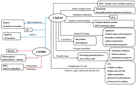 The schematic molecular model describing the main pathways involved in the acquisition of drought tolerance in maize seedling. The model was constructed based on our main common drought-responsive genes identified in this report, as well as plant abiotic stress pathway schemes previously described. The black and red pointing arrows display the main pathways which were enriched in CML69 and LX9801, respectively. The blue pointing arrows display the common pathways in both drought-tolerant and sensitive inbred lines. Abbreviation’s key: RWC, relative water content; LEA, late embryogenesis abundant; CL, coumarate-CoA ligase; TFs, transcription factors; ncRNAs, noncoding RNAs; lncRNAs, long noncoding RNAs; TE-lncRNAs, transposable elements long noncoding RNAs; RBCs, ribulose carboxylase.