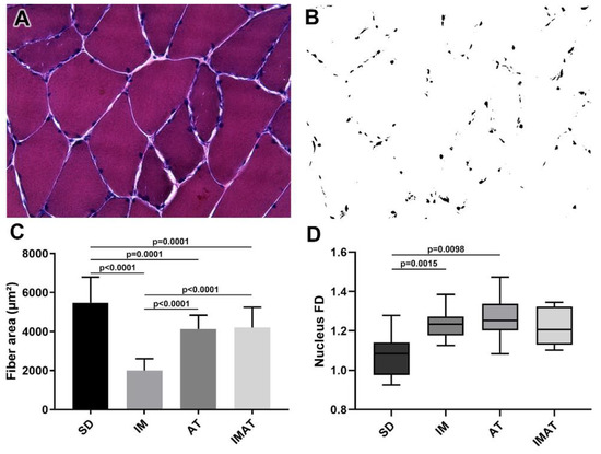 Analysis of muscle fibers of the belly of gastrocnemius muscle of Wistar rats. (A) Light microscopy of belly muscle in hematoxylin-eosin staining (HE), magnification: 400×. (B) Binarized image of HE staining with nucleus highlight for fractal dimension (FD) analysis. (C) Mean ± standard deviation of muscle fibers area (µm²) of sedentary (SD), immobilization (IM), aquatic training (AT), and immobilization/aquatic training (IMAT); SD ≠ AT (p = 0.0001), SD ≠ IM (p < 0.0001), SD ≠ IMAT (p = 0.0001), AT ≠ IM (p < 0.0001), and IM ≠ IMAT (p < 0.0001). (D) Box plot of nucleus FD analysis of groups; SD ≠ AT (p = 0.0015) and SD ≠ IM (p = 0.0098).