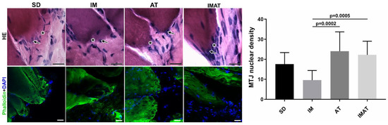The IM group had a lower MTJ nuclear density than the AT (p = 0.0002) and IMAT (p = 0.0005) groups. The other groups showed no significant difference (Figure 2).