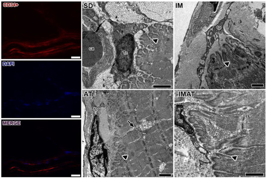 Telocytes analysis of MTJ region with immunostaining (CD34+), nucleus (DAPI), and the image with associated elements (MERGE). Bars: 20 µm. Transmission electron microscopy of MTJ of sedentary (SD), immobilization (IM), aquatic training (AT), and immobilization/aquatic training (IMAT) from gastrocnemius muscle of Wistar rats. In the myotendinous region the presence of blood capillary (ca) and telocyte (tc) with their projections the telopods (tp) is observed; these elements were observed adjacent to sarcoplasmatic invaginations (arrowhead), and in the AT group a prolonger branch of sarcoplasmatic invagination (arrow) with association with a vesicle group (v) is observed. Bars: 1 µm.