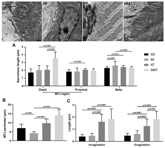 The IM group demonstrated a shorter MTJ perimeter than the SD (p = 0.001) and AT (p = 0.0004) groups. By contrast, the lengths of sarcoplasmatic invagination and evagination in the IM group were not significantly different from the SD group (p > 0.05) but were lower than the AT (p < 0.0001) and IMAT (p < 0.0001) groups.