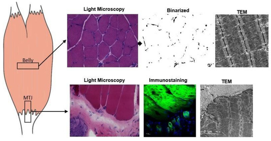 - Palma, L.D.; Marinelli, M.; Pavan, M.; Bertoni-Freddari, C. Involvement of the muscle-tendon junction in skeletal muscle atrophy: An ultrastructural study. Rom. J. Morphol. Embryol. 2011, 52, 105–109. [Google Scholar] [PubMed]