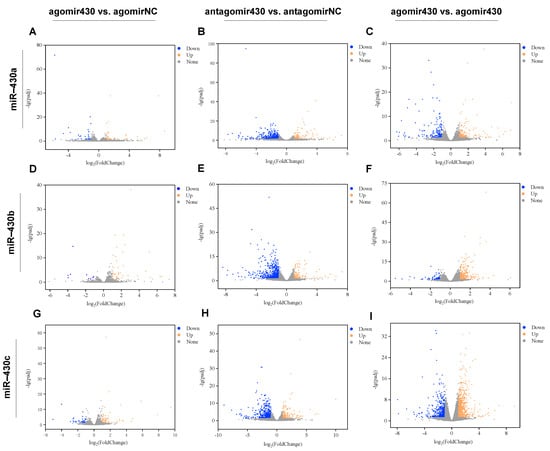 The statistics of DEGs identified in pairwise comparisons. (A) The agomir430a group compared with the agomirNC group; (B) The antagomir430a group compared with the antagomirNC group; (C) The agomir430a group compared with the antagomir430a group; (D) The agomir430b group compared with the agomirNC group; (E) The antagomir430b group compared with the antagomirNC group; (F) The agomir430b group compared with the antagomir430b group; (G) The agomir430c group compared with the agomirNC group; (H) The antagomir430c group compared with the antagomirNC group; (I) The agomir430c group compared with the antagomir430c group. n = 3 for each microinjection group.