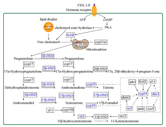 Steroidogenesis plays pivotal roles in regulating physiological divergence, gonadal differentiation, and sex determination []. In the past decades, significant advances have been achieved in the genetics, molecular biology, and biochemistry of genes related to steroidogenesis and sexual differentiation in mammals and teleosts [,,]. Steroidogenic enzymes consisting of the cytochrome P450 heme-containing proteins and the hydroxysteroid dehydrogenases [,] have been reported to alter the proportions as well as absolute and relative concentrations of sex hormones, thus resulting in sex differentiation [,]. Moreover, several transcription factors (SRY-box transcription factor 9, sox9; forkhead box L2, foxl2; steroidogenic factor 1, sf-1; Wilms tumor 1, wt1) have been found to be involved in the sex determination process [,,]. Cytochrome P450 family 19 subfamily a (cyp19a) has been identified to transform androgens into estrogens, which can be regulated by foxl2 together with other partners sf-1 [,]. Cytochrome P450 family 17 (cyp17) as the steroid synthase transcriptional activator has been reported to be negatively regulated by the interaction of foxl2 and sf-1 in granulosa cells []. Although some key genes have been identified, the critical network in sex steroid hormone synthesis as well as reproductive processes is still unclear and needs to be further investigated.