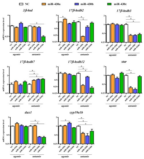 MicroRNAs (miRNAs), a class of 20–25 nt noncoding RNAs, induce degradation or translation inhibition of target mRNAs by binding to the 3′UTR of target genes []. The miRNAs have been reported to be involved in the processes of gametogenesis, embryogenesis, steroidogenesis, fertilization, sex differentiation, and reproduction in mammals [,]. For instance, cytochrome P450 11 beta (cyp11b) and cyp19a are regulated by miR-10b and miR-378, respectively [,]. The miRNA regulates ovarian hormone synthesis by targeting steroidogenic mRNAs [,,]. Similarly, several functional miRNA–target gene pairs such as miR-456/anti-Müllerian hormone (amh), miR-138/cyp17a2, and miR-20a/doublesex-mab3-related transcription factor1 (dmrt1) have been identified, revealing the critical roles of miRNA in steroidogenesis in fish []. The microRNA-430 family (miR-430s), as one of the most highly expressed miRNAs during fish development, regulates a number of target genes in embryogenesis [,]. The high expression of miR-430s during the early development of fish plays a vital role in the removal of maternal transcripts [,]. Moreover, the injection of miR-430 has been reported to rescue the brain defects in MZdicer mutants of zebrafish, revealing crucial roles for miR-430 during morphogenesis in fish []. In fish, three isoforms of miR-430 (a, b, c) have been identified to be homologous in the 3′ region and the target recognition sites at the 5′ end of miR-430 (a, b, c), for their target genes (such as C1q-like genes) are identical. [,,]. miR-430 has been reported to repress primordial germ cells (PGCs) development by directly targeting C1q-like in early embryos of Carassius auratus, indicating an essential role of miR-430 in embryogenesis []. Apart from its involvement in embryogenesis and morphogenesis, miR-430 is vital for the reproductive development, but its regulatory role in steroidogenesis remains unknown.