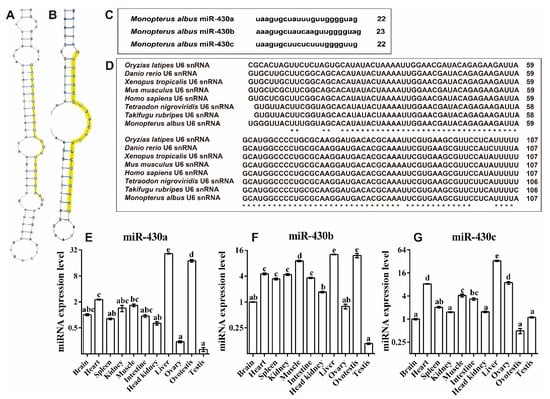 Identification of miR-430 family in rice field eel. Predicted secondary structures of miR-430a (A) and miR-430c (B) precursors in rice field eel. Representatives of each of two miR-430 groups are shown. Yellow shadings indicate mature regions and seed sequences, respectively. (C) miR-430 (a, b, c) sequences in rice field eel. (D) ClustalX alignment of the U6 snRNA from M. albus and other species. The star (*) represents the identical nucleotides. (E–G) The miRNA expression level of miR-430 in the brain, heart, spleen, kidney, muscle, intestine, liver, ovary, ovotestis, and testis. Data (mean ± SEM, n = 3) were normalized to the housekeeping gene (U6 snRNA). Bars that do not share a letter are significantly different among different tissues (p < 0.05).