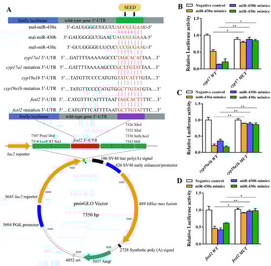 Schematic representation of the miR-430 target sequence within the 3′UTR of cyp17, cyp19a1b, and foxl2 (A) and activities of the luciferase reporter gene linked to the 3′UTR of cyp17 (B), cyp19a1b (C), and foxl2 (D). The pmirGLO luciferase reporter plasmids with the wild-type or mutated 3′UTR sequences of cyp17, cyp19a1b, and foxl2 were transiently transfected into HEK-29T cells along with 20 µM miR-430 mimics or negative control. Luciferase activities were measured after 24 h, and firefly luciferase was used for normalization. Values are means ± SEM., n = 3. * p < 0.05, ** p < 0.01. The experiment was repeated at least three times.