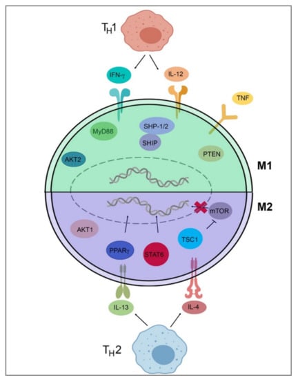 To detail Table 2 and Figure 2, TH1 cells secrete IFN-γ, which drives polarization of macrophages towards an M1 phenotype, while TH2 cells secrete IL-4 and IL-13, which drive M2-phenotype polarization [34,37]. IL-4 and IL-13 inhibit the production of nitric oxide, an inflammatory mediator, through the depletion of arginine, which serves as the substrate for iNOS/Nos2. This inhibition of NO production in macrophages was found to be dependent on IL-4 or IL-13 through the depletion of Arg-1 through a Stat6-dependent pathway [38]. This inhibition of NO production leads to a loss of the M1 phenotype and polarization toward the M2 phenotype through cytokines IL-4 and IL-13. IL-4 and LPS signaling can also target the mechanistic target of rapamycin (mTOR) and Akt to trigger polarization. In LPS-mediated M1 polarization, Toll-like receptor 4 (TLR4) activates phosphoinositide 3-kinase (PI3K) followed by Akt and mammalian target of rapamycin complex 1 (mTORC1) activation, leading to M1 polarization [39,40]. Additionally, pharmacological and genetic inhibition of Akt1/2 has shown that Akt1 inhibits M1 activation, and Akt2 leads to the activation of M1 genes, favoring polarization to the M1 phenotype [39,40]. Akt signaling is likely to control macrophage polarization through downstream effectors; for example, Akt signaling inhibits transcription factor Foxo1, which is a key gene in M1 macrophages. Additionally, Akt1 has been implicated as a negative regulator of the nuclear factor, kappa-light-chain-enhanced activity of activated B cells (NF-κB), while Akt2 is a positive regulator. NF-κB is a master regulator of M1 activation [41]. Src homology region 2 domain-containing phosphatase 1/2 (SHP-1/2) inhibits CD11b activity, therefore inhibiting M2 polarization and leading to an increase in M1-type macrophages [42]. Src homology 2 (SH2) domain-containing inositol polyphosphate 5-phosphatase (SHIP) is another phosphatase that inhibits the activation of M2-like macrophages. SHIP−/− peritoneal and alveolar macrophages have been found to be profoundly M2-skewed, with high arginase I levels and impaired LPS-stimulated NO production [43]. Phosphatase and tensin homolog (PTEN) plays a key role in regulating the inflammatory response through M1-polarization. Mice with a myeloid-specific PTEN knockout have been shown to have levels of M2 macrophages and produce lower TNF-α and higher IL-10 in response to TLR ligands, indicating that PTEN plays a key role in M1 macrophage differentiation [44]. Tumor necrosis factor (TNF) has been found to be a positive regulator of M1 polarization through its activation of the NF-κB pathway. Tumor necrosis factor receptor (TNFR) signaling was found to be a negative regulator of M2 polarization in tumor-associated macrophages (TAMs), and myeloid differentiation primary response 88 (MyD88) was shown to suppress M2 gene expression in TAMs, leading to an M1 phenotype [45].