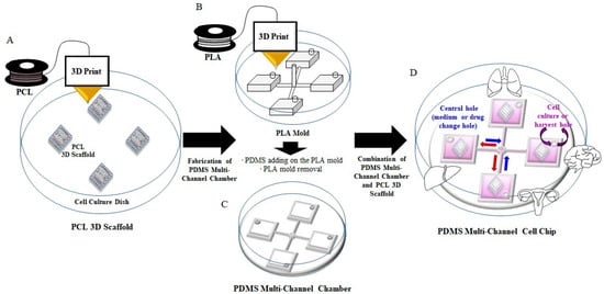 Schematic diagram of the polydimethylsiloxane (PDMS) multi-channel cell chip (PMCCC). (A) PCL 3D scaffold. (B) PLA mold. (C) PDMS multi-channel chamber. (D) PMCCC.