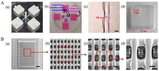 (A) Photograph and optical image of polycaprolactone (PCL) mold (a), polydimethylsiloxane (PDMS) multi-channel chamber (b), each channel (c), scale bar: 200 µm) and chamber (d). (B) Scanning electron microscope (SEM) images of the polycaprolactone (PCL) three-dimensional (3D) scaffold within PDMS multi-channel cell chip chip (a, scale bar: 1 mm). Partially magnified SEM image of the 3D scaffold (b–d, scale bar: 100 µm).