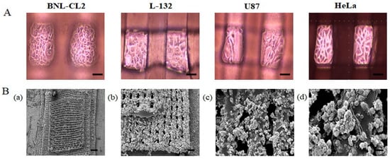 (A) Optical images of the four cell types (BNL-CL2, L-132, U87, and HeLa) cultured on a polydimethylsiloxane (PDMS) multi-channel cell chip with a polycaprolactone (PCL) three-dimensional (3D) scaffold. (B) SEM image of HeLa cells cultured on the PDMS multi-channel cell chip with a PCL 3D scaffold (a); scale bar: 1 mm). Partially magnified SEM image of HeLa cells cultured on the first and second floors of the 3D structure (b); scale bar: 200 µm). Partially magnified SEM image of HeLa cells cultured on the first floor of the 3D structure (c); scale bar: 50 µm). Partially magnified SEM image of the third floor of the 3D structure (d); scale bar: 10 µm).
