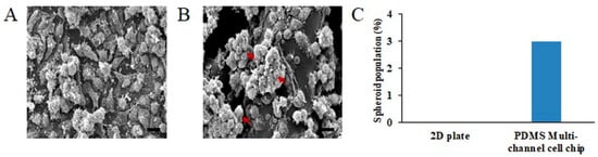 Scanning electron microscope (SEM) images of the comparison of HeLa cell morphology in a two-dimensional (2D) plate (A) and, polydimethylsiloxane (PDMS) multi-channel cell chip (B) (scale bar: 10 µm). Results of the number of spheroid cells obtained by SEM image (C).