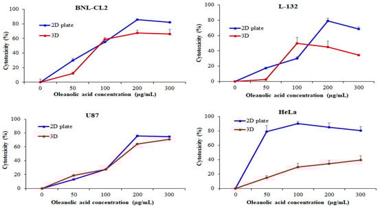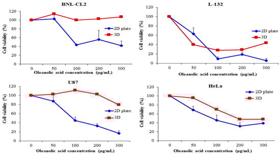 Cell viability evaluation of normal cell lines (BNL-CL2 and L-132) and cancer cell lines (U87 and HeLa) cultured in a two-dimensional (2D) plate and polydimethylsiloxane (PDMS) multi-channel cell chip, using the 3-(4,5-dimethylthiazol-2-yl)-2,5-diphenyl tetrazolium bromide (MTT) assay. The cells were cultured at 1 × 105 cells/mL and treated with oleanolic acid (OA; 50, 100, 200, 300 µg/mL) for 24 h. The relative cell viability was calculated as the percentage of untreated cells. The data are represented as mean ± SD, n = 3.