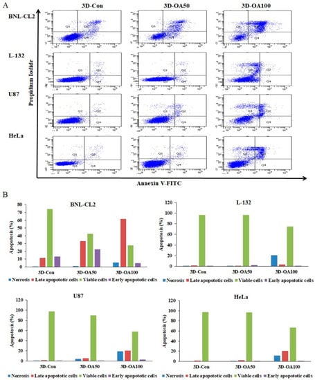(A) Determination of the apoptotic populations of normal cells (BNL-CL2 and L-132 cells) and cancer cells (U87 and HeLa cells) Annexin V-fluorescein isothiocyanate (FITC)/propidium iodide (PI) staining and subjecting to flow cytometry in polydimethylsiloxane (PDMS) multi-channel cell chip. The cells were cultured at 1 × 105 cells/mL and treated with oleanolic acid (OA; 50 and 100 µg/mL) for 24 h. (B) Quantitation of the data shown in (A).