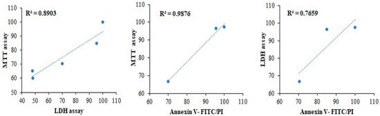 Figure 8 shows the correlation of the drug effect through MTT and LDH assays, and Annexin V-FITC/PI staining in HeLa cells cultured on the PMCCC. Cell viability of drug resistance was correlated to the MTT and LDH assays, and Annexin V-FITC/PI staining using exponential regression. First, when the correlation between the MTT assay and LDH assay was analyzed, the results showed a positive correlation with R2 values of 0.8903. Second, the correlation between the MTT assay and Annexin V staining showed R2 values of 0.9876. Finally, the R2 values of the LDH assay and annexin V staining were 0.7659. The strongest correlation of HeLa cells cultured in PMCCC was correlated with the MTT assay and Annexin V-FITC/PI staining. When experimenting in a new environment, correlation analysis of various assays is important to find suitable assays. In addition, the experimental consistency can be confirmed through the correlation analysis. Motskin et al. demonstrated that synthetic colloid and gel hydroxyapatite uptake in human monocyte-derived macrophages correlated with each of the cytotoxicity assays (confocal live–dead, MTT, and LDH assays) by exponential regression analysis []. Our results suggest that the MTT assay, LDH assay, and Annexin V-FITC/PI staining are suitable for the PMCCC.