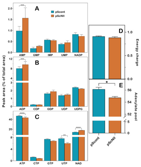 A comparison of the nucleotide content, determined by high performance capillary electrophoresis (HPCE) analysis, of control and silenced NCI-H292 cells, revealed no significant alteration of the intracellular level of IMP and GMP, the best substrate for cN-II, whereas a significant increase of AMP (1.56 ± 0.47 vs. 0.98 ± 0.20, p = 0.0004) concentration was observed (Figure 1A). In addition, ADP (9.68 ± 1.23 vs. 8.06 ± 0.73, p < 0.0004) and total NAD (oxidized and reduced) (17.81 ± 0.12 vs. 14.05 ± 0.30, p < 0.0001) concentrations increased (Figure 1B,C), whereas ATP (43.50 ± 1.76 vs. 47.11 ± 0.86, p < 0.0001) and UTP (5.96 ± 0.31 vs. 7.65 ± 0.26, p = 0.0045) were slightly decreased in pScNII cells (Figure 1C). Therefore, cN-II silencing decreased the rate of purine nucleoside monophosphate degradation, leading to the accumulation of AMP and ADP that cannot be readily phosphorylated to ATP. This caused a modest, but significant decrease of the triphosphorylated compounds ATP and UTP. Nevertheless, the energy charge ([ATP] + 0.5[ADP])/([AMP] + [ADP] + [ATP]) was not significantly altered, whereas the total adenylate content (AMP+ADP+ATP) was slightly lowered in silenced cells (Figure 1D,E).