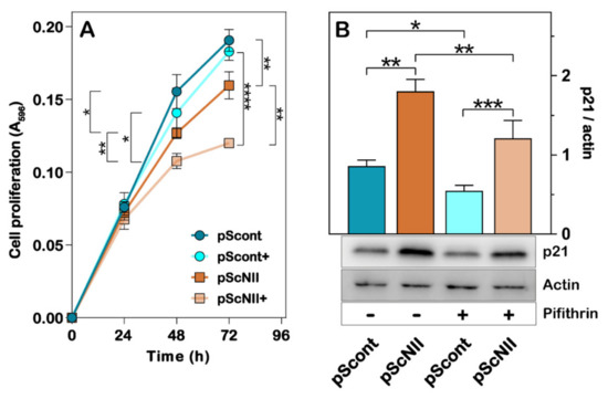Mucoepidermoid pulmonary carcinoma cell lines (NCI-H292) partially silenced (pScNII) with the respective control (pScont) were developed by stable transfection of shRNA as indicated in [22]. The cell lines were routinely tested for Mycoplasma contamination by PCR. Human NCI-H292 cells were cultured in RPMI containing 10 mM glucose, 10% FBS, 1% glutamine, 100 U/mL penicillin and 100 U/mL streptomycin (standard medium). The cells were cultured in an incubator with 5% CO2 at 37 °C. Cell proliferation assay was performed by the crystal violet staining method [37]. Briefly, 12 h before treatment, four 24 multi-well culture plates were seeded with 0.8 mL of standard medium containing 20,000 cells/well. When indicated, cells were exposed to 10 µM pifithrin-α and after 0, 24, 48 and 72 h of incubation, the medium was removed and the cells were stained with 0.1% crystal violet solution in methanol for 30 min at 37 °C under gentle shaking. Then, the plates were carefully washed three times in distilled water and dried. Acetic acid (0.6 mL, 10%) was added to the wells and kept 15 min at room temperature under gentle shaking. One hundred microliters from each well were transferred into a 96 multi-well for the quantitative analysis by absorbance measurements at 596 nm in an automatic ultra-microplate reader EL 808 Bio-Tek Instruments. Inc. (Winooski, VT, USA).