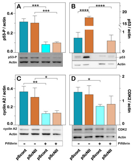 Expression of p53 was higher in pScNII cells than in pScont cells, whereas both intracellular concentration and phosphorylation were reduced by pifithrin-α (Figure 3A,B). For a better understanding of the molecular mechanisms underlying the observed effect of cN-II silencing on NCI-H292 cell proliferation, we also measured, through immunoblotting, the expression of cyclin A2 and cyclin-dependent kinase 2 (CDK2), which are both known to be involved in the cell cycle progression [25]. No significant difference in the expression of cyclin A2 and CDK2 was found in pScNII cells as compared to pScont. Consistently with the effect exerted by pifithrin-α on NCI-H292 cell growth (Figure 2A), the p53 inhibitor significantly reduced the expression of both proteins (Figure 3C,D).