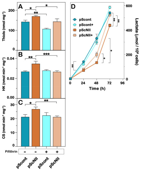 The lactate concentration was determined in the medium of pScont and pScNII cells grown as described in 4.2. In the presence and absence of 10 µM pifithrin-α. At 0, 24, 48, and 72 h incubation, 500 µL of the medium were withdrawn and centrifuged 5 min at 10,000× g. Two µL of the supernatant was used for the assay as described by Liaud et al. [45]. The colorimetric detection of lactate exploits two sequential oxido-reduction reactions. The first one is the conversion of L-lactate and O2 into pyruvate and H2O2, catalyzed by the stereospecific l-lactate oxidase. In the second reaction, catalyzed by HRP, the chromogenic substrate ABTS is oxidized by H2O2 produced in first reaction. The oxidized ABTS absorbs at 420 nm and dyes the reaction mixture in green. The ABTS oxidation is proportional to L-lactate concentration which can be calculated from a standard curve of known L-lactate concentration.