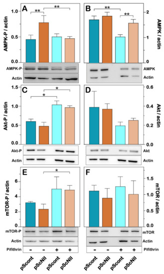 The expression of total Akt was not affected by cN-II silencing (Figure 5D), whereas the activated Akt (Akt-P), showed a tendency to decrease, in silenced cells compared to the control (Figure 5C). In the presence of pifithrin-α, total Akt expression showed a tendency to decrease (Figure 5D) whereas Akt phosphorylation increased in both cell models. Accordingly, the activated form of mTOR (mTOR-P) showed a tendency to decrease in pScNII cells, whereas in the presence of pifithrin-α, the expression of the phosphorylated mTOR increased significantly in pScNII cells (Figure 5E). No significant difference in the expression of total mTOR was observed in pScont and pScNII cells in the presence and absence of pifithrin-α (Figure 5F).