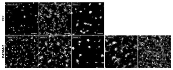 Adherence of platelets (PLT) on plasma-treated cyclic olefin copolymer (pCOC). Platelet-rich plasma (PRP) was incubated under static conditions for 1 h at 37 °C with basal medium containing nine supplements (P-EGM-2) in a ratio of 1:1 resulting in a concentration of 50,000 PLT µL−1. PRP served as control. PLT of six different donors were stained with phalloidin conjugated with Alexa Fluor 555 and images were taken by confocal laser scan microscopy at 100-fold primary magnification. As platelet adherence was similar for all six donors and for all supplements tested, representative images of PLT of one donor are shown for the complete medium (P-EGM-2) and for the control PRP. Scale bar represents 20 µm.