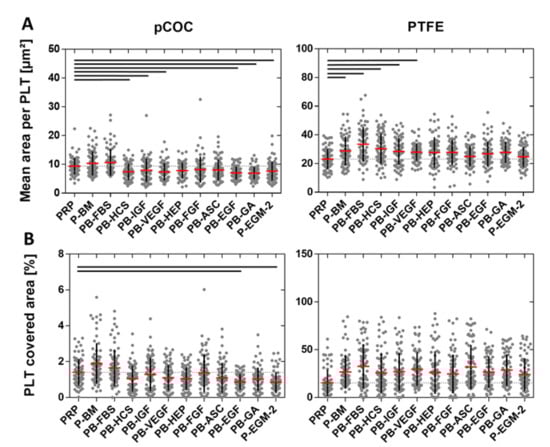 The PLT covered area is another parameter for the assessment of thrombogenicity. While on pCOC, only 1.2 ± 0.3% of the area was covered by PLT, a considerably larger area of 26.5 ± 4.2% was covered by PLT on PTFE (p ≤ 0.0001). In particular, on pCOC, the PLT covered area after incubation with PRP (1.4 ± 0.7%) was larger than with all supplements apart from PB-BM and PB-FBS. However, these differences were only significant in case of PB-EGF (0.9 ± 0.5%; p = 0.0028) and P-EGM-2 (0.9 ± 0.6%; p = 0.0005). In contrast, on PTFE, the PLT covered area was significantly increased after contact of PLT with all supplements (ranging from 24.0 ± 17.2% to 32.5 ± 22.8%; p ≤ 0.0475) compared to PRP (15.3 ± 13.7%) (Figure 3B).