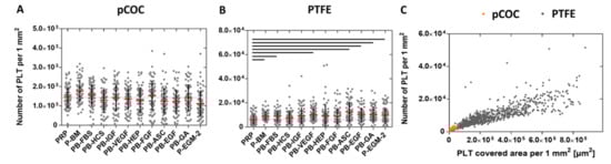 Apart from the polymer-dependent PLT adherence, a high variability in the number of adherent PLT and the PLT covered area was observed for PLT of individual donors on PTFE. Donor variability affecting cell differentiation and other diverse cellular responses is documented in various research areas such as tissue engineering or transfusion medicine [22,23]. This is particularly important for autologous therapies as patients (and their cells) are often of advanced age. Thus, studies increasingly use age-matched cells or animals to better reflect the situation in this group of patients [24]. The data of the present study confirm once more that inter-donor variability exists and that the hemocompatibility of biomaterials should be analyzed either individually for each recipient in a personalized approach or at least using PLT of a substantial number of donors.