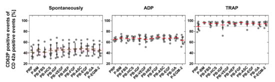 Amount of activated platelets. Platelet-rich plasma (PRP) was mixed with basal medium (BM) or with BM containing one of nine different supplements or with BM containing all nine supplements (see Table 1 for nomenclature) in a ratio of 1:1. PRP served as control. PLT were incubated for 5 min with different supplements (spontaneous activation) or with supplements and a platelet activator (adenosine diphosphate (ADP) or thrombin receptor activating peptide (TRAP)) prior to fixation and immunological staining to detect the surface markers CD42a (platelet marker) and CD62P (platelet activation marker) by flow cytometry. Thin dashed line shows the value for PRP (control). Data represent the arithmetic mean (red) ± standard deviation (black), n = 7.