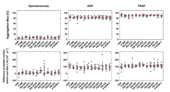 Aggregation of platelets. Platelet-rich plasma (PRP) was mixed with basal medium (BM) or with BM containing one of nine different supplements or with BM containing all nine supplements (see Table 1 for nomenclature) in a ratio of 1:1. PRP served as control. PLT were incubated for 10 min under rotation with different supplements (spontaneous aggregation) or in the presence of activators (adenosine diphosphate (ADP) or thrombin receptor activating peptide (TRAP)) prior to the assessment of the maximal aggregation by light transmission aggregometry (LTA) (first row). The difference of PLT number before and after LTA was calculated to indirectly assess PLT aggregation (second row). Thin dashed line shows the maximal aggregation for PRP (control). Data represent the arithmetic mean (red) ± standard deviation (black), n = 8.
