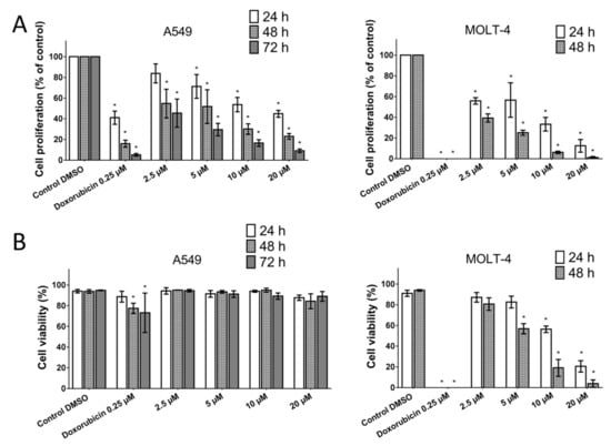 Cell proliferation and viability of MOLT-4 and A549 cells were monitored 24, 48, and 72 h after treatment with 2.5, 5, 10, and 20 μM of pancracine in the case of A549 cells (1.5 × 105 cell in 5 mL placed in 25-cm2 Falcon flasks) and 24 and 48 h in the case of MOLT-4 cells (1 × 106 cell in 5 mL placed in 25-cm2 Falcon flasks) with the same concentration range of pancracine. Cells treated with 0.25-µM doxorubicin were used as a positive control. Cell membrane integrity was determined using the Trypan blue exclusion technique—mixing 10 μL of 0.4% Trypan blue and 10 μL of cell suspension. The Trypan blue dye exclusion test is used to determine the percentage of viable cells and number of viable cells present in a cell suspension. It is based on the principle that live cells possess intact cell membranes that exclude certain dyes, such as Trypan Blue, whereas dead cells do not. The assay is easy to perform; a cell suspension is mixed with dye and then visually examined by microscope to determine whether cells take up or exclude the dye. Then, the individual cells are observed using a bright-field Nikon Eclipse E200 light microscope (Nikon, Tokyo, Japan); a viable cell will have a clear cytoplasm, whereas a nonviable cell will have a blue cytoplasm. In this assay, a hemocytometer (Bürker counting chamber) was used to determine exactly the number of cells in a suspension. We counted 25 squares (=1 horizontal line + 1 vertical line + 1 square). We counted only cells that were within the 0.2 mm × 0.2 mm squares. We did not count cells that overlapped over the border. The surface of each square was 0.2 mm × 0.2 mm = 0.04 mm2. With a height of 0.1 mm, the volume was 0.004 mm3. Therefore, 25 squares corresponded to a volume of 0.1 mm3 (=0.1 μL). Multiplication by 10,000 gave 1 mL. The calculation of proliferation in % followed this formula: (number of viable cells after treatment/number of viable cells in control DMSO) multiplied by 100. The calculation of viability in % followed this formula: (number of viable cells after treatment/number of total cells) multiplied by 100.