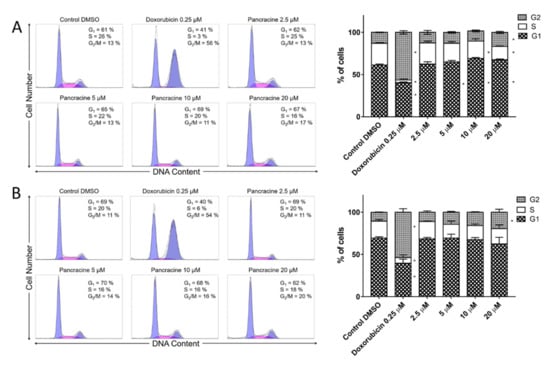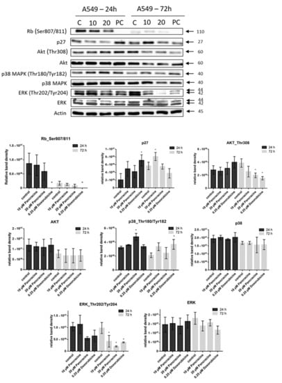 25]. Our results show that the proliferation of A549 cells is inhibited by cell cycle arrest in the G1 phase through the upregulation of phosphorylated p38 MAPK after 24 h and either a 10- or 20-µM pancracine treatment. Cell cycle arrest initiated through the downregulation of phosphorylated pRb protein, upregulation of p27 concomitantly with the downregulation of Akt kinase phosphorylated on Thr308, and downregulation of ERK was observed after a longer time interval (72 h) using the same experimental conditions. Besides, apoptosis is not induced at the cellular level, as proved by the activity of caspase-3/7, -8, and -9 in A549 cells. For a better overview,