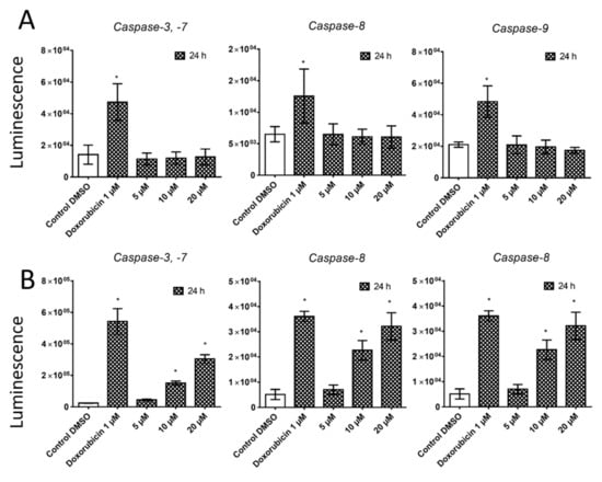 The induction of programmed cell death was determined by monitoring the activities of caspases-3/7, caspase-8, and caspase-9 by Caspase-Glo Assays (Promega, Madison, WI, USA) 24 h after treatment with 5, 10, and 20 μM of pancracine. Cells treated with 1 µM of doxorubicin were used as a positive control. The assay provides a proluminogenic substrate in an optimized buffer system. The addition of a Caspase-Glo Reagent results in cell lysis, followed by caspase cleavage of the substrate and the generation of a luminescent signal. A total of 1 × 104 cells were seeded per well using a 96-well plate format (Sigma-Aldrich, St. Louis, MO, USA). After treatment, the Caspase-Glo Assay Reagent was added to each well (50 μL/well) and incubated for 30 min before luminescence was measured using a Tecan Infinite M200 microplate reader (Tecan Group, Männedorf, Switzerland).