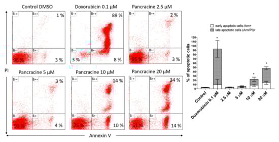 27]. In this study, the leukemic MOLT-4 cells died due to apoptosis activation at 5 μM, increasing the activity of effector caspase-3/7 and the activation of caspase -9 responsible for the mitochondrial apoptosis pathway and caspase-8 responsible for the pathway through death receptors. The apoptosis of MOLT-4 cells significantly increased 24 h after the exposure to a 10-μM dose of pancracine, as detected using Annexin V and PI staining. Using a concentration of 20 μM, 50% of the cells were either in the early or late phase of apoptosis. Activation of the ATM/Chk2/p53 signaling pathway was described in MOLT-4 cells after ionizing radiation exposure [