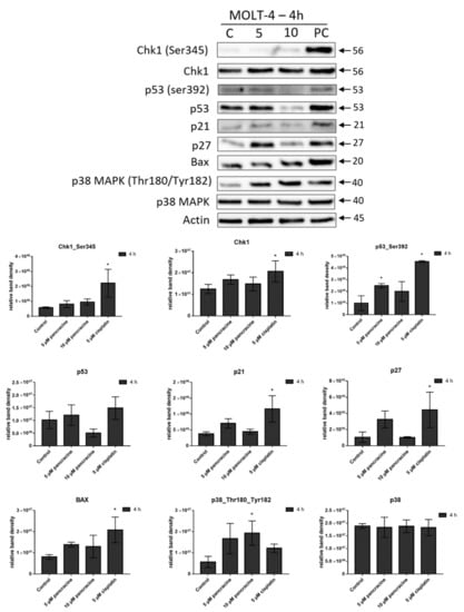 Whole-cell lysates (Cell Lysis Buffer; Cell Signaling Technology, Danvers, MA, USA) were prepared 24 and 72 h following the treatment of A549 with 10 μM and 20 μM of pancracine and 4 h following the treatment of MOLT-4 cells with 5 μM and 10 μM of pancracine. Cells treated with 0.1% DMSO were used as a negative control. Cells treated with either 5 μM of cisplatin or 0.25 µM of doxorubicin were used as a positive control. Quantification of the protein content was performed using the BCA assay (Sigma-Aldrich, St. Louis, MO, USA). The lysates (20 µg of purified protein) were loaded into lanes of polyacrylamide gel. After electrophoresis separation, the proteins were transferred to a PVDF membrane (Bio-Rad, Hercules, CA, USA). Any nonspecific bindings of the membranes were blocked for 1 h in a Tris-buffered saline (TBS) containing 0.05% Tween 20 and 5%, w/v, nonfat dry milk. The membranes were washed in TBS. Incubation with a primary antibody against specific antigens and at the appropriate dilutions (1:1000 Chk1, 1:1000 Chk1_serine 345—Cell Signalling, Danvers, MA, USA; 1:1000 Rb, 1:1000 Rb_serine 807/811—Cell Signalling, Danvers, MA, USA; 1:10,000 β-actin—Sigma-Aldrich, St. Louis, MO, USA; 1:1000 ERK, 1:1000 ERK ½_threonine 202 and tyrosine 204—Cell Signalling, Danvers, MA, USA; 1:1000 p53 and 1:1000 p53_serine 392—Exbio, Prague, Czech Republic; 1:1000 p53_serine 15—Cell Signalling, Danvers, MA, USA; 1:1000 p21—Cell Signalling, Danvers, MA, USA; 1:1000 p27—Cell Signalling, Danvers, MA, USA; 1:1000 Akt and 1:1000 Akt_threonine 308—Cell Signalling, Danvers, MA, USA; 1:1000 p38, 1:1000 p38_ threonine 180, and tyrosine 182—Cell Signalling, Danvers, MA, USA; and 1:1000 Bax—Cell Signalling, Danvers, MA, USA) was performed at 4 °C overnight. The following day, the membranes were washed 5 times with TBS, each time for 5 min, and once with TBS for 10 min and then incubated with an appropriate secondary antibody (DakoCytomation, Glostrup, Denmark, or Cell Signalling, Danvers, MA, USA) in a dilution of 1:1000 for 1 h at room temperature. Band detection was performed using a chemiluminescence detection kit (Roche, Basel, Switzerland). To ensure equal protein loading, each membrane was reprobed, and β-actin was detected. The densities of the proteins of interest were analyzed using the GeneTools image analysis system (Syngene, Cambridge, UK).
