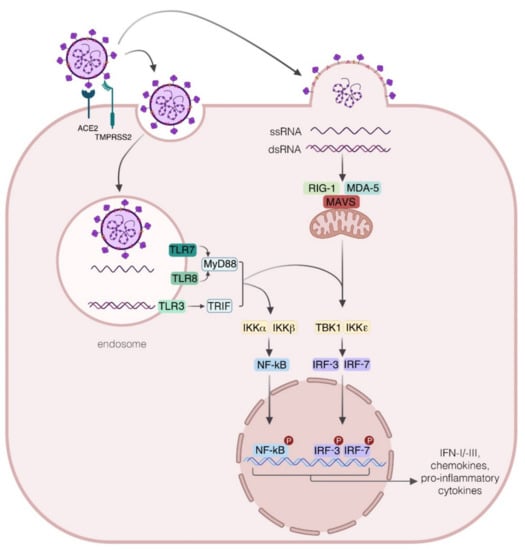 Innate immune response to SARS-CoV-2. The interaction of SARS-CoV-2 with targeted cells requires the recognition of viral spike (S) protein by the angiotensin-converting enzyme (ACE2) and the priming of the S protein by the host cell transmembrane serine protease 2 (TMPRSS2). SARS-CoV-2 can gain access to host cells by means of the endocytic pathway that allows virus localization into the endosomes, where the viral single-stranded (ss) RNA is detected by the endosomal Toll-like receptors (TLR)7 and 8. Soon after viral RNA recognition, the adapter protein myeloid differentiation factor 88 (MyD88), is engaged for the activation and nuclear translocation of transcriptional factors nuclear factor kappa light-chain-enhancer of activated B cells (NF-κB) and interferon regulatory factor-3 (IRF-3) and 7 (IRF-7) for the transcription of genes encoding for proinflammatory cytokines and type I and III interferons (IFNs). In addition, TLR3 can be activated by double stranded (ds) RNA, produced during viral replication, thus contributing via the TRIF pathway to a protective response in SARS-CoV-2 infection. The sensing of replicating virus also occurs by the cytosolic receptor retinoic acid-inducible gene I (RIG-I) and the melanoma differentiation-associated protein (MDA5), which in turn recruits the mitochondrial antiviral signaling protein (MAVS), then leading to the IRF-3 and IRF-7 phosphorylation required for the expression of IFNs. IKKα: I-Kappa-B Kinase Alpha; IKKβ: I-Kappa-B Kinase Beta; IKKε: I-Kappa-B kinase epsilon; TBK1: TANK binding kinase 1; TRIF: TIR domain-containing adapter protein inducing interferon (IFN)-β.