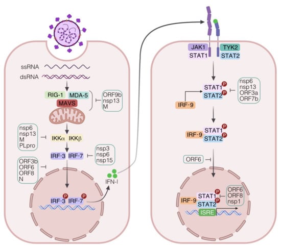 Regarding the viral proteins antagonizing type I IFN signaling, nsp6, nsp13, ORF3a, and ORF7b prevent both STAT1 and STAT2 phosphorylation []. Similarly, SARS-CoV-2 N, ORF6, and M proteins suppress the type I IFN pathway by blocking both STAT phosphorylation and their nuclear translocation [,].