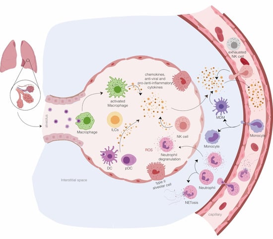A broad single-cell analysis was conducted by Liao et al. to characterize immune cells present in BALFs from COVID-19 patients with different degrees of disease severity in comparison to healthy individuals, and this study revealed interesting information on the local immune response to SARS-CoV-2 infection []. Macrophages, neutrophils, myeloid DC (mDC), pDC, NK cells, T cells, B cells, plasma cells, and epithelial cells were found in all the analyzed groups, although at different ratios according to disease severity. For instance, BALFs of SARS-CoV-2 affected patients showed a higher frequency of monocytes, macrophages, and neutrophils than healthy controls. When compared to mild cases, in BALFs from severe patients, a higher percentage of macrophages and neutrophils, but a smaller amount of mDC, pDC, T, and NK cells, was observed []. Therefore, it is conceivable that substantial recruitment to the lung of proinflammatory immune cells, particularly macrophages and neutrophils, might contribute especially in COVID-19 patients with severe symptoms to excessive inflammation resulting in systemic manifestations and multiorgan dysfunctions []. With this in mind, we focused our attention on cells participating in innate immune responses, namely monocytes, macrophages, DCs, NK, neutrophils, and ILCs and dissected their role in SARS-CoV-2-mediated disease (Figure 4).