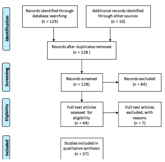 The PRISMA study flowchart is shown in Figure 1. Our search identified 128 records after removing duplicates. After scanning the titles and abstracts, 84 citations were excluded, and 44 were have been assessed for full-text eligibility. After examining the full text, 37 case-control, case series studies, randomized controlled trials and meta-analyses studies were considered eligible and included in this study.