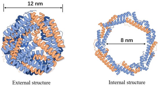 Ferritin was first discovered in horse spleen in 1937 []. It is a water-soluble protein that naturally exists in most organisms [,]. Ferritin is a 450 kDa spherical hollow nanocage. Its outside diameter is about 12 nm and inside diameter is about 8 nm. It can bind approximately 4500 iron atoms in a nontoxic and bioavailable form [,,]. The ferritin’s coating of mammals is self-assembled by 24 subunits, of which 80–90% is L-chain (light chain; 19 kDa), and 10–20% is H-chain (heavy chain; 21 kDa). There are a large number of salt bridges and hydrogen bonds between the subunits (Figure 1) [,]. In 2010, Seaman et al. [] discovered that human heavy chain ferritin (HFn) can specifically recognize the highly expressed transferrin 1 receptor (TfR1) on tumor cells. This discovery greatly promoted the research of ferritin as tumor treatment nanocarriers.