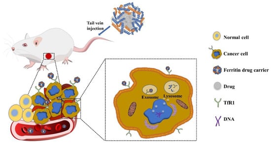 Ferritin is proved to have the ability to naturally target tumor cells, and the initial accumulation of nanocarriers in tumors mainly depends on passive targeting. New angiogenesis and poor lymphatic drainage in tumor tissues cause the EPR effect [,,]. The EPR effect is closely related to the size distribution of nanoparticles. Ferritin shows an excellent size distribution and hardly change when loading drugs, which is significantly better than chemically synthesized nanoparticles [,]. Due to the high iron metabolism and iron demand of tumor cells, the expression of TfR1 in cancer cells may be 100 times higher than that in normal cells [,]. Therefore, HFn can specifically recognize and bind to the TfR1 receptor on tumor cells. After interacting with TfR1, HFn can be effectively delivered to the lysosome through TfR1-mediated endocytosis [] (Figure 2). It is speculated that the drugs contained in ferritin are gradually released during lysosomal acidification. In addition, there is evidence that ferritin is translocated into the nucleus by an active transport mechanism. Ferritin releases a small amount of drugs in the cytoplasm to induce a DNA damage, then the cell itself sends out harmful stimulation signals, triggering the recruitment of H-rich apoferritins into the nucleus []. The mechanism of how ferritin release drugs remains to be further studied.