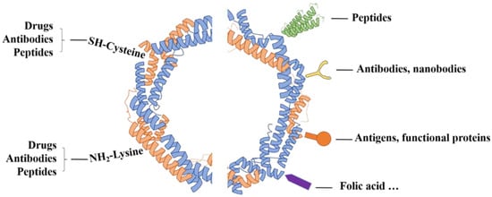 Although ferritin has the ability to naturally target tumor cells, the therapeutic efficiency of a single targeted drug carrier is usually limited due to the difference in the expression of TfR1 on different tumor cells. Researchers have modified the surface of the ferritin nanocage with antibodies, peptides, etc., to give it dual-targeting characteristics, and obtain better targeting capabilities and the ability to penetrate into tumor cells (Table 1, Figure 3). At present, the methods of surface modification of ferritin mainly include modification of targeting motifs on the surface of ferritin through genetic engineering and coupling of chemical groups to lysine and cysteine residues on the surface of ferritin nanocages [].