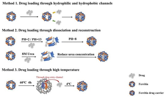 Research on ferritin as a nano-drug delivery system has a history of more than ten years. At present, there are three main drug delivery methods for ferritin (Figure 6). Most anti-cancer drugs are hydrophobic, while ferritin is water-soluble and can wrap the drugs in the cavity through hydrophobic action []. Moreover, the natural targeting ability of ferritin enables the effective enrichment of drugs at the tumor site. There is strong evidence that ferritin as a chemotherapeutic drug carrier can improve the efficacy of drugs, simultaneously reduce the side effects, such as cardiotoxicity of doxorubicin. The earliest successful loading of ferritin was metal nanoparticles. When ferritin is incubated with a metal ion source, since the inner cavity of ferritin has a strong negative charge, positively charged metal ions (Au, Cu, Co, etc.) can easily migrate through the pores of the ferritin nanocage and accumulate in the cavity.